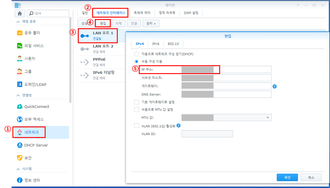(제어판 -> 네트워크 -> 네트워크 인터페이스 -> LAN포트 1 -> 편집 -> IPv4 -> IP주소에서 확인 가능)