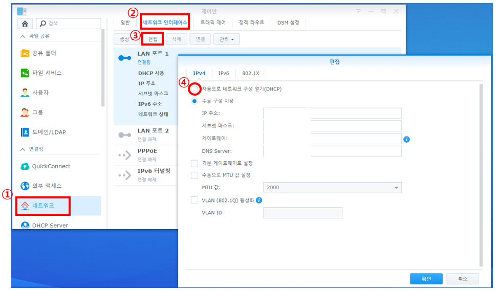 DSM 제어판 접속 후 -> 네트워크 -> 네트워크 인터페이스 -> 연결된 LAN포트 클릭 후 편집 -> "자동으로 네트워크 구성 체크"