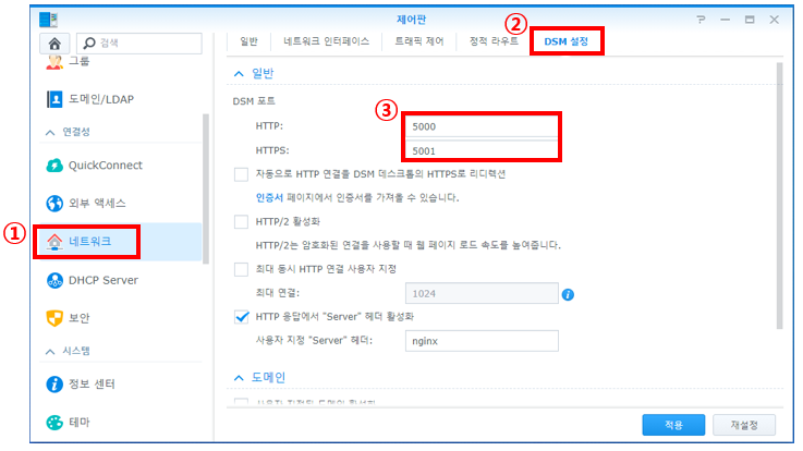 포트 확인 및 수정은 "제어판 -> 네트워크 -> DSM 설정 -> DSM포트"에서 변경할 수 있습니다.