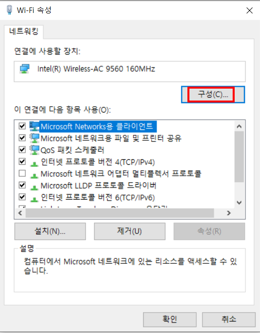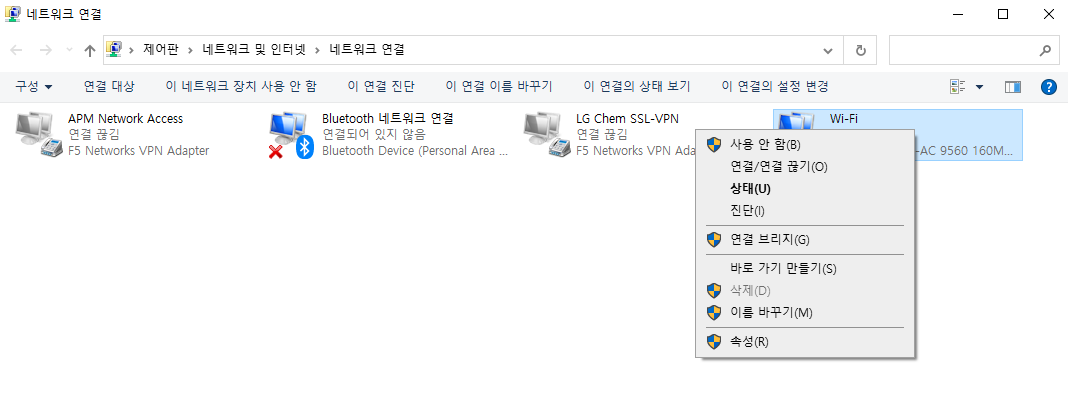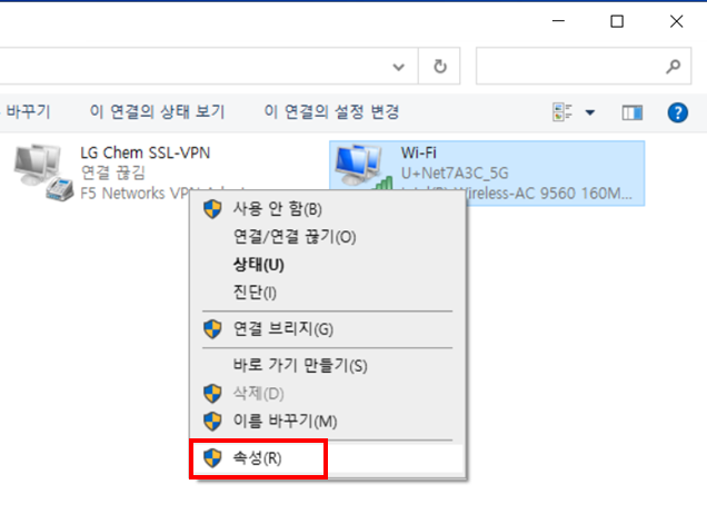 1) 네트워커 어댑터 설정 -> 와이파이 어댑터 우클릭 -> 속성 클릭