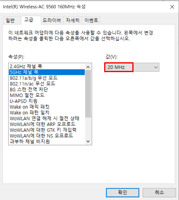 3) 5GHz 채널 폭을 자동 -> 20MHz로 변경