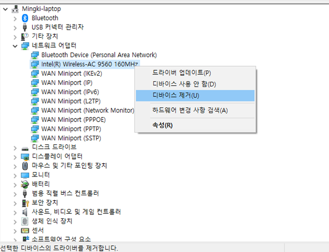 4. 장치관리자에서 무선랜 드라이버 제거 후 재부팅