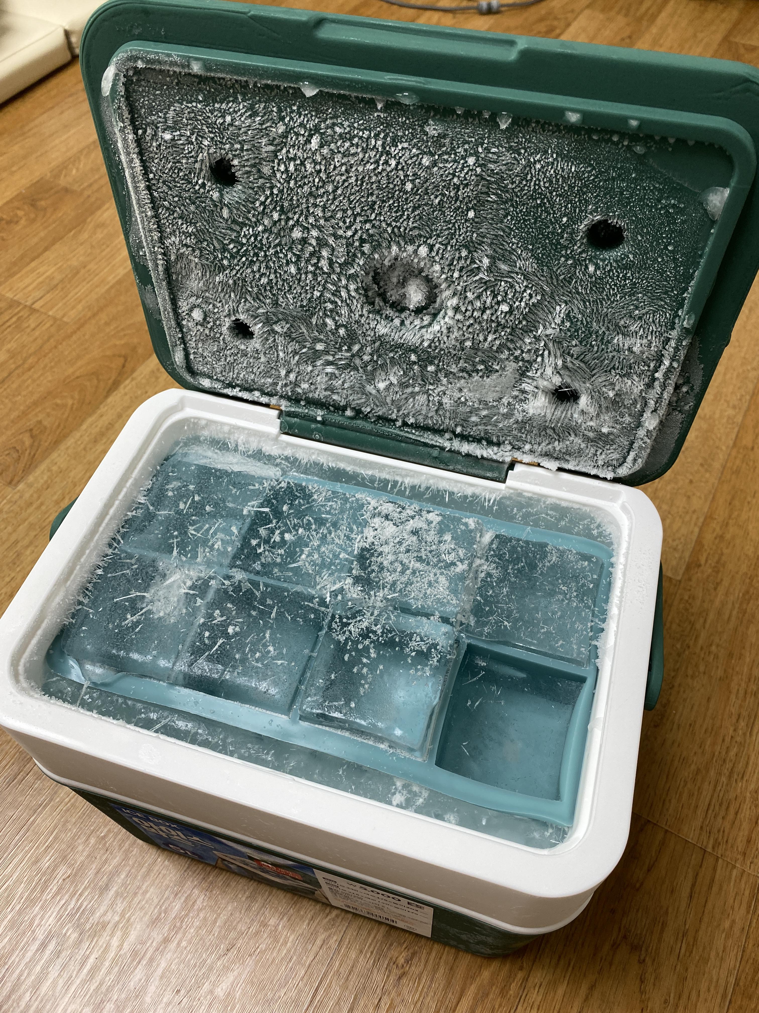 보통은 아이스박스에 물을 채워 천천히 얼리게 되는데, 그럴 경우 상대적으로 표면부터 얼음이 얼기 시작하여 아이스박스의 중심부는 가장 나중에 얼게 됩니다.