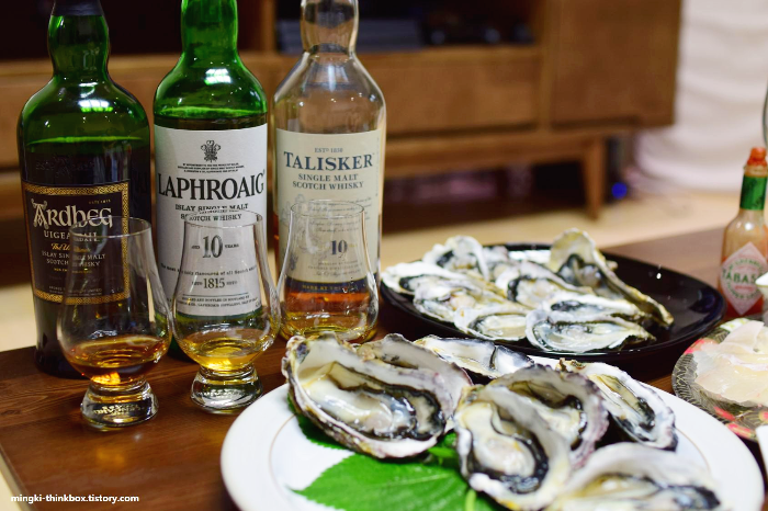 어쩌다 보니 와인 얘기를 잔뜩 써 놓았는데, 사실 화이트 와인 말고도 굴과 궁합이 좋은 주류가 또 있습니다. 바로 피트 위스키죠