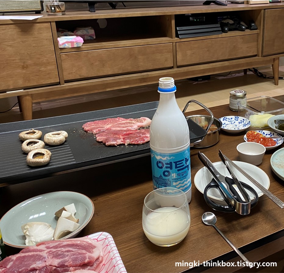 고기를 먹을 때 영탁 막걸리를 함께 먹어봤는데, 고기와도 잘 어울렸습니다.